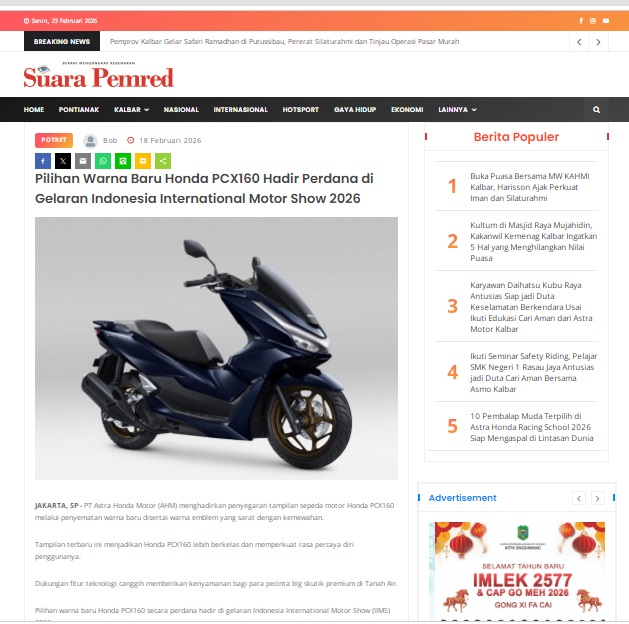 Pilihan Warna Baru Honda PCX160 Hadir Perdana di Gelaran Indonesia International Motor Show 2026 by masmul 18 Februari 2026 in Silahkan kunjungi https://www.suarapemredkalbar.com/read/potret/18022026/pilihan-warna-baru-honda-pcx160-hadir-perdana-di-gelaran-indonesia-international-motor-show-2026. You Might Like Regional Public Launching New ADV160 The SUV Pride Grand Launching New PCX 160 Truly Exceptional! Tetap hati-hati ya bro sist berkendara saat hujan.