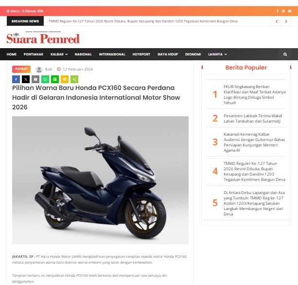 Pilihan Warna Baru Honda PCX160 Secara Perdana Hadir di Gelaran Indonesia International Motor Show 2026 by masmul 12 Februari 2026 in Silahkan kunjungi https://www.suarapemredkalbar.com/read/potret/12022026/pilihan-warna-baru-honda-pcx160-secara-perdana-hadir-di-gelaran-indonesia-international-motor-show-2026. You Might Like Regional Public Launching New ADV160 The SUV Pride Grand Launching New PCX 160 Truly Exceptional! Tetap hati-hati ya bro sist berkendara saat hujan.