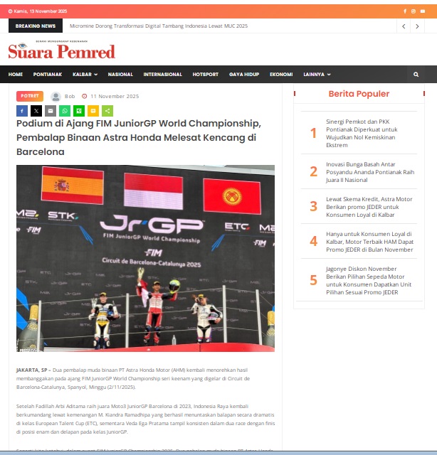 Podium di Ajang FIM JuniorGP World Championship, Pembalap Binaan Astra Honda Melesat Kencang di Barcelona by masmul 11 November 2025 in Silahkan kunjungi https://www.suarapemredkalbar.com/read/potret/11112025/podium-di-ajang-fim-juniorgp-world-championship-pembalap-binaan-astra-honda-melesat-kencang-di-barcelona. You Might Like Regional Public Launching New ADV160 The SUV Pride Grand Launching New PCX 160 Truly Exceptional! Tetap hati-hati ya bro sist berkendara saat hujan.