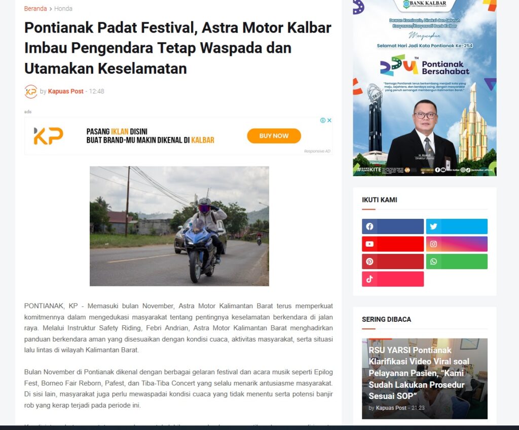 Pontianak Padat Festival, Astra Motor Kalbar Imbau Pengendara Tetap Waspada dan Utamakan Keselamatan by Muhammad Arif 25 Oktober 2025 in Silahkan kunjungi https://www.kapuaspost.web.id/2025/10/pontianak-padat-festival-astra-motor.html. Tags: astra Astra Motor kalbar Astra Motor Pontianak astramotor honda kalbar pontianak sepeda motor You Might Like Regional Public Launching New ADV160 The SUV Pride Grand Launching New PCX 160 Truly Exceptional! Tetap hati-hati ya bro sist berkendara saat hujan.