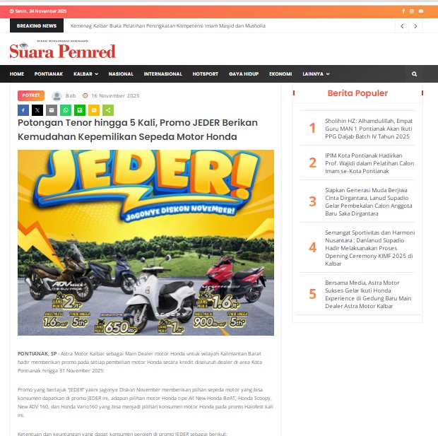 Potongan Tenor hingga 5 Kali, Promo JEDER Berikan Kemudahan Kepemilikan Sepeda Motor Honda by masmul 16 November 2025 in Silahkan kunjungi https://www.suarapemredkalbar.com/read/potret/16112025/potongan-tenor-hingga-5-kali-promo-jeder-berikan-kemudahan-kepemilikan-sepeda-motor-honda. You Might Like Regional Public Launching New ADV160 The SUV Pride Grand Launching New PCX 160 Truly Exceptional! Tetap hati-hati ya bro sist berkendara saat hujan.