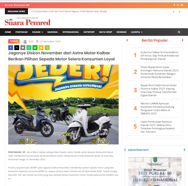 POTRETpost authorBob27 November 2025 facebook sharing buttontwitter sharing buttonemail sharing buttonwhatsapp sharing buttonline sharing buttonsms sharing buttonsharethis sharing button by masmul 28 November 2025 in Silahkan kunjungi https://www.suarapemredkalbar.com/read/potret/27112025/jagonye-diskon-november-dari-astra-motor-kalbar-berikan-pilihan-sepeda-motor-selera-konsumen-loyal. You Might Like Regional Public Launching New ADV160 The SUV Pride Grand Launching New PCX 160 Truly Exceptional! Tetap hati-hati ya bro sist berkendara saat hujan.