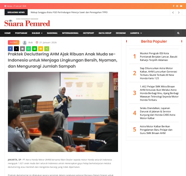 Praktek Decluttering AHM Ajak Ribuan Anak Muda se-Indonesia untuk Menjaga Lingkungan Bersih, Nyaman, dan Mengurangi Jumlah Sampah by masmul 21 Januari 2026 in Silahkan kunjungi https://www.suarapemredkalbar.com/read/potret/21012026/praktek-decluttering-ahm-ajak-ribuan-anak-muda-se-indonesia-untuk-menjaga-lingkungan-bersih-nyaman-dan-mengurangi-jumlah-sampah. You Might Like Regional Public Launching New ADV160 The SUV Pride Grand Launching New PCX 160 Truly Exceptional! Tetap hati-hati ya bro sist berkendara saat hujan.