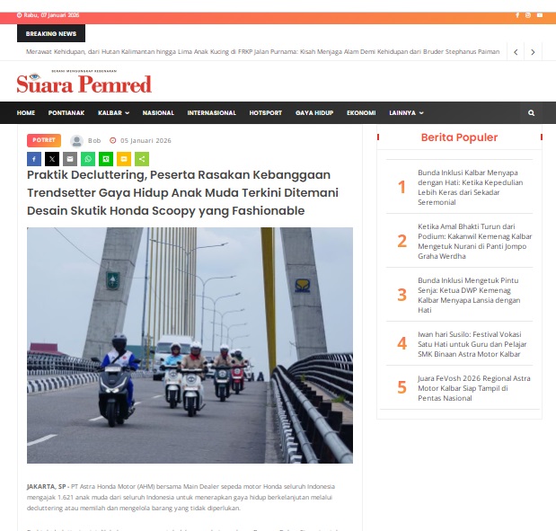 Praktik Decluttering, Peserta Rasakan Kebanggaan Trendsetter Gaya Hidup Anak Muda Terkini Ditemani Desain Skutik Honda Scoopy yang Fashionable by masmul 5 Januari 2026 in Silahkan kunjungi https://www.suarapemredkalbar.com/read/potret/05012026/praktik-decluttering-peserta-rasakan-kebanggaan-trendsetter-gaya-hidup-anak-muda-terkini-ditemani-desain-skutik-honda-scoopy-yang-fashionable. You Might Like Regional Public Launching New ADV160 The SUV Pride Grand Launching New PCX 160 Truly Exceptional! Tetap hati-hati ya bro sist berkendara saat hujan.