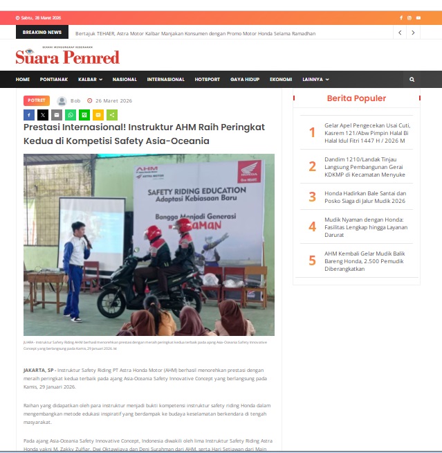Prestasi Internasional! Instruktur AHM Raih Peringkat Kedua di Kompetisi Safety Asia-Oceania by masmul 26 Maret 2026 in Silahkan kunjungi https://www.suarapemredkalbar.com/read/potret/26032026/prestasi-internasional-instruktur-ahm-raih-peringkat-kedua-di-kompetisi-safety-asia-oceania. You Might Like Regional Public Launching New ADV160 The SUV Pride Grand Launching New PCX 160 Truly Exceptional! Tetap hati-hati ya bro sist berkendara saat hujan.