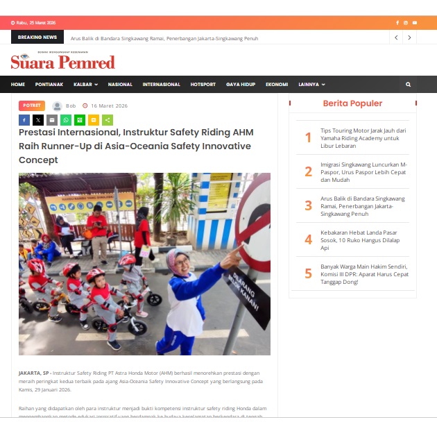 Prestasi Internasional, Instruktur Safety Riding AHM Raih Runner-Up di Asia-Oceania Safety Innovative Concept by masmul 16 Maret 2026 in Silahkan kunjungi https://www.suarapemredkalbar.com/read/potret/16032026/prestasi-internasional-instruktur-safety-riding-ahm-raih-runner-up-di-asia-oceania-safety-innovative-concept. You Might Like Regional Public Launching New ADV160 The SUV Pride Grand Launching New PCX 160 Truly Exceptional! Tetap hati-hati ya bro sist berkendara saat hujan.