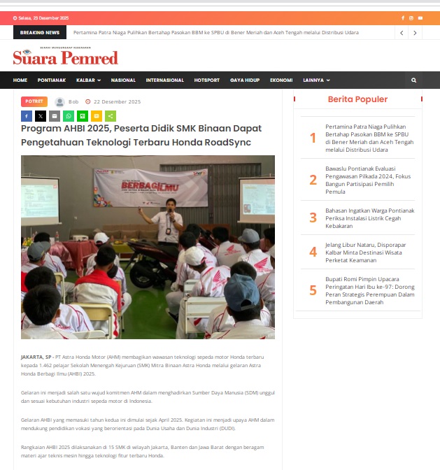 Program AHBI 2025, Peserta Didik SMK Binaan Dapat Pengetahuan Teknologi Terbaru Honda RoadSync by masmul 22 Desember 2025 in Silahkan kunjungi https://www.suarapemredkalbar.com/read/potret/22122025/program-ahbi-2025-peserta-didik-smk-binaan-dapat-pengetahuan-teknologi-terbaru-honda-roadsync. You Might Like Regional Public Launching New ADV160 The SUV Pride Grand Launching New PCX 160 Truly Exceptional! Tetap hati-hati ya bro sist berkendara saat hujan.
