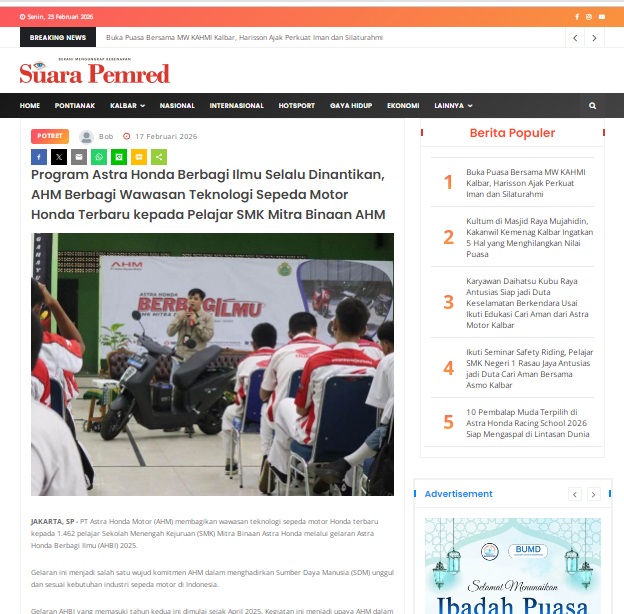 Program Astra Honda Berbagi Ilmu Selalu Dinantikan, AHM Berbagi Wawasan Teknologi Sepeda Motor Honda Terbaru kepada Pelajar SMK Mitra Binaan AHM by masmul 17 Februari 2026 in Silahkan kunjungi https://www.suarapemredkalbar.com/read/potret/17022026/program-astra-honda-berbagi-ilmu-selalu-dinantikan-ahm-berbagi-wawasan-teknologi-sepeda-motor-honda-terbaru-kepada-pelajar-smk-mitra-binaanahm. You Might Like Regional Public Launching New ADV160 The SUV Pride Grand Launching New PCX 160 Truly Exceptional! Tetap hati-hati ya bro sist berkendara saat hujan.