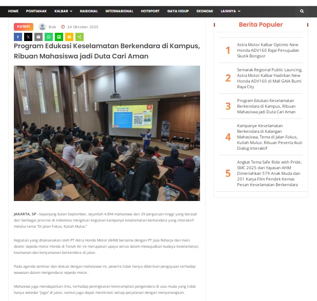 Program Edukasi Keselamatan Berkendara di Kampus, Ribuan Mahasiswa jadi Duta Cari Aman by masmul 24 Oktober 2025 in Silahkan kunjungi https://www.suarapemredkalbar.com/read/potret/24102025/program-edukasi-keselamatan-berkendara-di-kampus-ribuan-mahasiswa-jadi-duta-cari-aman. You Might Like Regional Public Launching New ADV160 The SUV Pride Grand Launching New PCX 160 Truly Exceptional! Tetap hati-hati ya bro sist berkendara saat hujan.