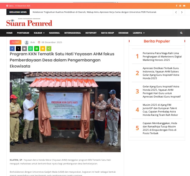 Program KKN Tematik Satu Hati Yayasan AHM fokus Pemberdayaan Desa dalam Pengembangan Ekowisata by masmul 8 Desember 2025 in Silahkan kunjungi https://www.suarapemredkalbar.com/read/potret/08122025/program-kkn-tematik-satu-hati-yayasan-ahm-fokus-pemberdayaan-desa-dalam-pengembangan-ekowisata. You Might Like Regional Public Launching New ADV160 The SUV Pride Grand Launching New PCX 160 Truly Exceptional! Tetap hati-hati ya bro sist berkendara saat hujan.
