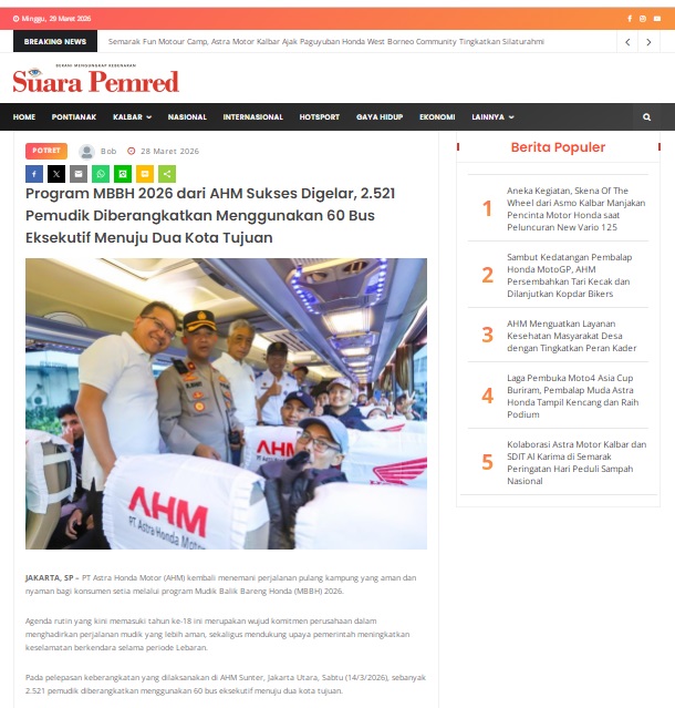 Program MBBH 2026 dari AHM Sukses Digelar, 2.521 Pemudik Diberangkatkan Menggunakan 60 Bus Eksekutif Menuju Dua Kota Tujuan by masmul 28 Maret 2026 in Silahkan kunjungi https://www.suarapemredkalbar.com/read/potret/28032026/program-mbbh-2026-dari-ahm-sukses-digelar-2521-pemudik-diberangkatkan-menggunakan-60-bus-eksekutif-menuju-dua-kota-tujuan. You Might Like Regional Public Launching New ADV160 The SUV Pride Grand Launching New PCX 160 Truly Exceptional! Tetap hati-hati ya bro sist berkendara saat hujan.