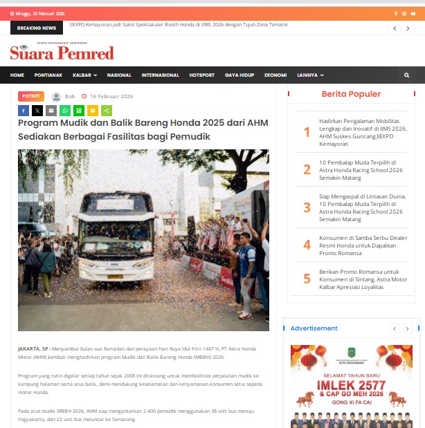 Program Mudik dan Balik Bareng Honda 2025 dari AHM Sediakan Berbagai Fasilitas bagi Pemudik by masmul 16 Februari 2026 in Silahkan kunjungi https://www.suarapemredkalbar.com/read/potret/16022026/program-mudik-dan-balik-bareng-honda-2025-dari-ahm-sediakan-berbagai-fasilitas-bagi-pemudik. You Might Like Regional Public Launching New ADV160 The SUV Pride Grand Launching New PCX 160 Truly Exceptional! Tetap hati-hati ya bro sist berkendara saat hujan.