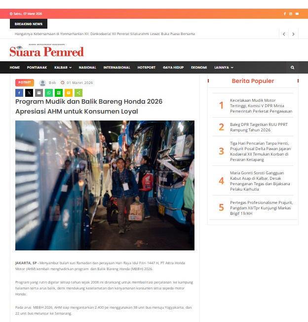 Program Mudik dan Balik Bareng Honda 2026 Apresiasi AHM untuk Konsumen Loyal by masmul 1 Maret 2026 in Silahkan kunjungi https://www.suarapemredkalbar.com/read/potret/01032026/programmudik-dan-balik-bareng-honda-2026-apresiasi-ahm-untuk-konsumen-loyal. You Might Like Regional Public Launching New ADV160 The SUV Pride Grand Launching New PCX 160 Truly Exceptional! Tetap hati-hati ya bro sist berkendara saat hujan.