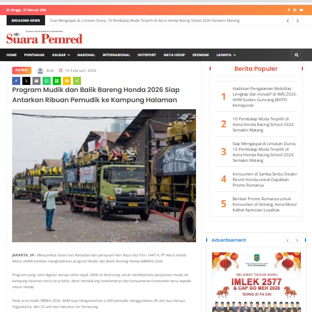 Program Mudik dan Balik Bareng Honda 2026 Siap Antarkan Ribuan Pemudik ke Kampung Halaman by masmul 16 Februari 2026 in Silahkan kunjungi https://www.suarapemredkalbar.com/read/potret/16022026/program-mudik-dan-balik-bareng-honda-2026-siap-antarkan-ribuan-pemudik-ke-kampung-halaman. You Might Like Regional Public Launching New ADV160 The SUV Pride Grand Launching New PCX 160 Truly Exceptional! Tetap hati-hati ya bro sist berkendara saat hujan.