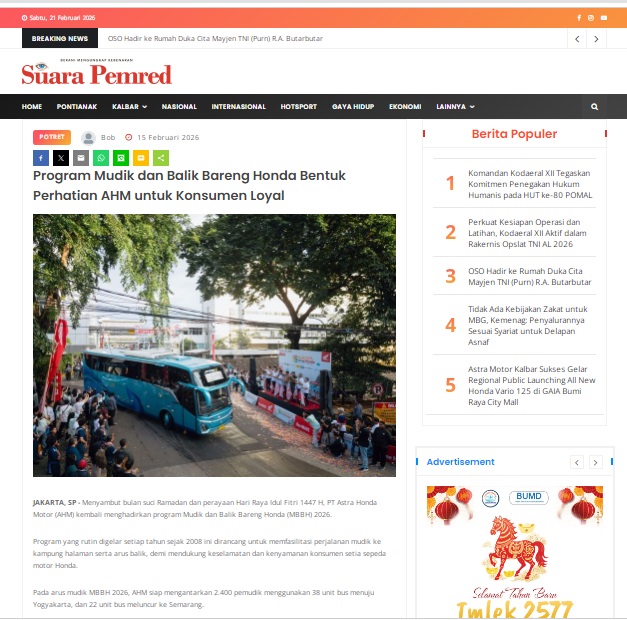Program Mudik dan Balik Bareng Honda Bentuk Perhatian AHM untuk Konsumen Loyal by masmul 15 Februari 2026 in Silahkan kunjungi https://www.suarapemredkalbar.com/read/potret/15022026/program-mudik-dan-balik-bareng-honda-bentuk-perhatian-ahm-untuk-konsumen-loyal. You Might Like Regional Public Launching New ADV160 The SUV Pride Grand Launching New PCX 160 Truly Exceptional! Tetap hati-hati ya bro sist berkendara saat hujan.