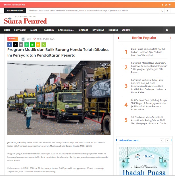 Program Mudik dan Balik Bareng Honda Telah Dibuka, Ini Persyaratan Pendaftaran Peserta by masmul 18 Februari 2026 in Silahkan kunjungi https://www.suarapemredkalbar.com/read/potret/18022026/program-mudik-dan-balik-bareng-honda-telah-dibuka-ini-persyaratan-pendaftaran-peserta. You Might Like Regional Public Launching New ADV160 The SUV Pride Grand Launching New PCX 160 Truly Exceptional! Tetap hati-hati ya bro sist berkendara saat hujan.