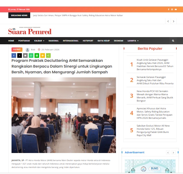 Program Praktek Decluttering AHM Semarakkan Rangkaian Berpacu Dalam Sinergi untuk Lingkungan Bersih, Nyaman, dan Mengurangi Jumlah Sampah by masmul 25 Februari 2026 in Silahkan kunjungi https://www.suarapemredkalbar.com/read/potret/25022026/program-praktek-decluttering-ahm-semarakkan-rangkaian-berpacu-dalam-sinergi-untuk-lingkungan-bersih-nyaman-dan-mengurangi-jumlah-sampah. You Might Like Regional Public Launching New ADV160 The SUV Pride Grand Launching New PCX 160 Truly Exceptional! Tetap hati-hati ya bro sist berkendara saat hujan.