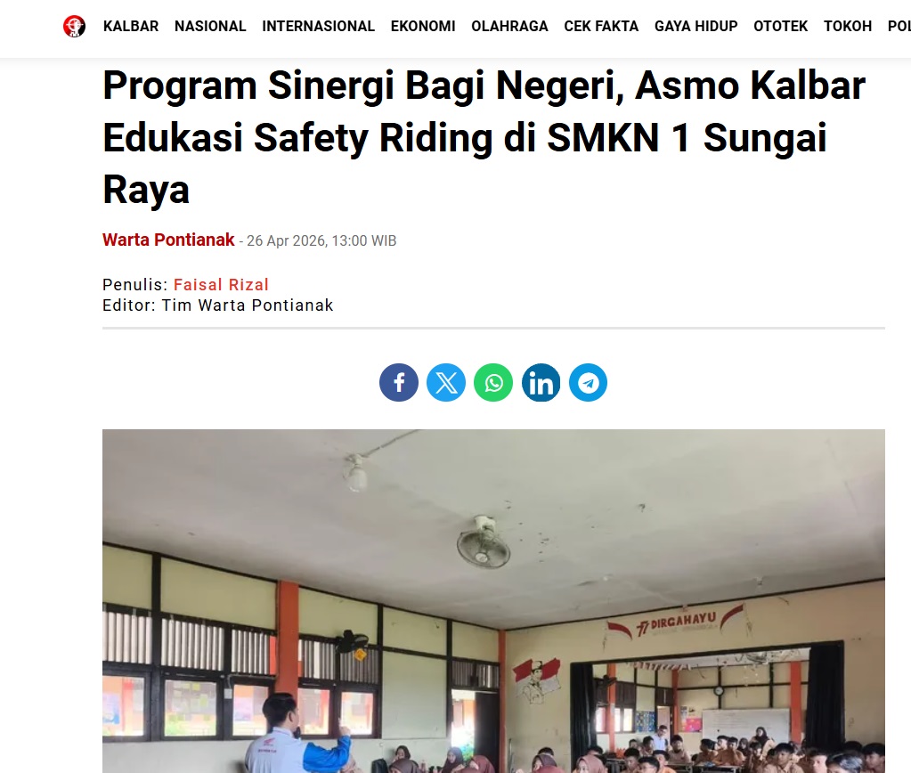 Program Sinergi Bagi Negeri, Asmo Kalbar Edukasi Safety Riding di SMKN 1 Sungai Raya by Faisal Rizal 26 April 2026 in Silahkan kunjungi https://wartapontianak.pikiran-rakyat.com/gaya-hidup/pr-11710166267/program-sinergi-bagi-negeri-asmo-kalbar-edukasi-safety-riding-di-smkn-1-sungai-raya. You Might Like Regional Public Launching New ADV160 The SUV Pride Grand Launching New PCX 160 Truly Exceptional! Tetap hati-hati ya bro sist berkendara saat hujan.