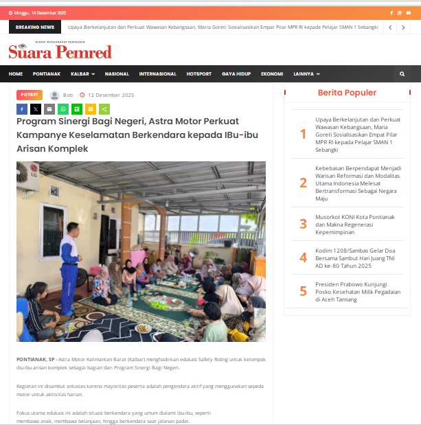 Program Sinergi Bagi Negeri, Astra Motor Perkuat Kampanye Keselamatan Berkendara kepada IBu-ibu Arisan Komplek by masmul 12 Desember 2025 in Silahkan kunjungi https://www.suarapemredkalbar.com/read/potret/12122025/program-sinergi-bagi-negeri-astra-motor-perkuat-kampanye-keselamatan-berkendara-kepada-ibu-ibu-arisan-komplek. You Might Like Regional Public Launching New ADV160 The SUV Pride Grand Launching New PCX 160 Truly Exceptional! Tetap hati-hati ya bro sist berkendara saat hujan.