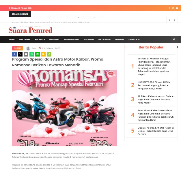 Program Spesial dari Astra Motor Kalbar, Promo Romansa Berikan Tawaran Menarik by masmul 5 Februari 2026 in Silahkan kunjungi https://www.suarapemredkalbar.com/read/potret/05022026/program-spesial-dari-astra-motor-kalbar-promo-romansa-berikan-tawaran-menarik. You Might Like Regional Public Launching New ADV160 The SUV Pride Grand Launching New PCX 160 Truly Exceptional! Tetap hati-hati ya bro sist berkendara saat hujan.
