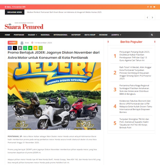 Promo Bertajuk JEDER: Jagonye Diskon November dari Astra Motor untuk Konsumen di Kota Pontianak by masmul 14 November 2025 in Silahkan kunjungi https://www.suarapemredkalbar.com/read/potret/14112025/promo-bertajuk-jeder-jagonye-diskon-november-dari-astra-motor-untuk-konsumen-di-kota-pontianak. You Might Like Regional Public Launching New ADV160 The SUV Pride Grand Launching New PCX 160 Truly Exceptional! Tetap hati-hati ya bro sist berkendara saat hujan.
