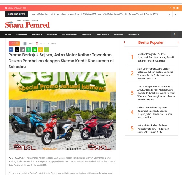 Promo Bertajuk Sejiwa, Astra Motor Kalbar Tawarkan Diskon Pembelian dengan Skema Kredit Konsumen di Sekadau by masmul 20 Januari 2026 in Silahkan kunjungi https://www.suarapemredkalbar.com/read/potret/20012026/promo-bertajuk-sejiwa-astra-motor-kalbar-tawarkan-diskon-pembelian-dengan-skema-kredit-konsumen-di-sekadau. You Might Like Regional Public Launching New ADV160 The SUV Pride Grand Launching New PCX 160 Truly Exceptional! Tetap hati-hati ya bro sist berkendara saat hujan.