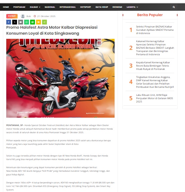 Promo Halofest Astra Motor Kalbar Diapresiasi Konsumen Loyal di Kota Singkawang by masmul 21 Oktober 2025 in Silahkan kunjungi https://www.suarapemredkalbar.com/read/potret/21102025/promo-halofest-astra-motor-kalbar-diapresiasi-konsumen-loyal-di-kota-singkawang. You Might Like Regional Public Launching New ADV160 The SUV Pride Grand Launching New PCX 160 Truly Exceptional! Tetap hati-hati ya bro sist berkendara saat hujan.