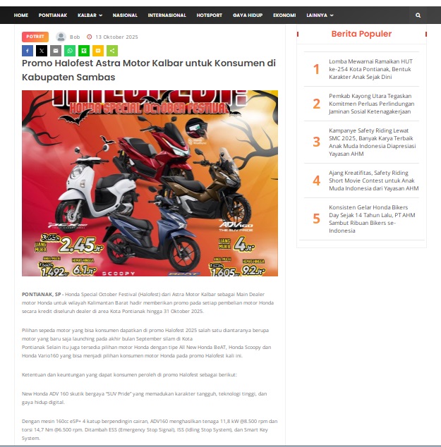 Promo Halofest Astra Motor Kalbar untuk Konsumen di Kabupaten Sambas by masmul 13 Oktober 2025 in Silahkan kunjungi https://www.suarapemredkalbar.com/read/potret/13102025/promo-halofest-astra-motor-kalbar-untuk-konsumen-di-kabupaten-sambas. You Might Like Regional Public Launching New ADV160 The SUV Pride Grand Launching New PCX 160 Truly Exceptional! Tetap hati-hati ya bro sist berkendara saat hujan.