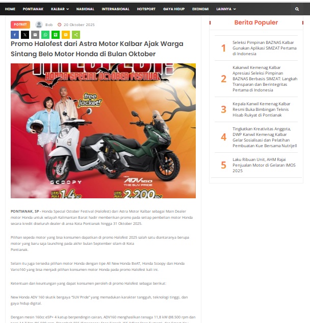 Promo Halofest dari Astra Motor Kalbar Ajak Warga Sintang Belo Motor Honda di Bulan Oktober by masmul 20 Oktober 2025 in Silahkan kunjungi https://www.suarapemredkalbar.com/read/potret/20102025/promo-halofest-dari-astra-motor-kalbar-ajak-warga-sintang-belo-motor-honda-di-bulan-oktober. You Might Like Regional Public Launching New ADV160 The SUV Pride Grand Launching New PCX 160 Truly Exceptional! Tetap hati-hati ya bro sist berkendara saat hujan.