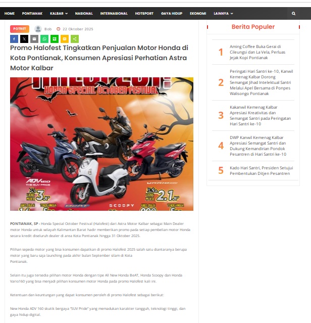 Promo Halofest Tingkatkan Penjualan Motor Honda di Kota Pontianak, Konsumen Apresiasi Perhatian Astra Motor Kalbar by masmul 22 Oktober 2025 in Silahkan kunjungi https://www.suarapemredkalbar.com/read/potret/22102025/promo-halofest-tingkatkan-penjualan-motor-honda-di-kota-pontianak-konsumen-apresiasi-perhatian-astra-motor-kalbar. You Might Like Regional Public Launching New ADV160 The SUV Pride Grand Launching New PCX 160 Truly Exceptional! Tetap hati-hati ya bro sist berkendara saat hujan.