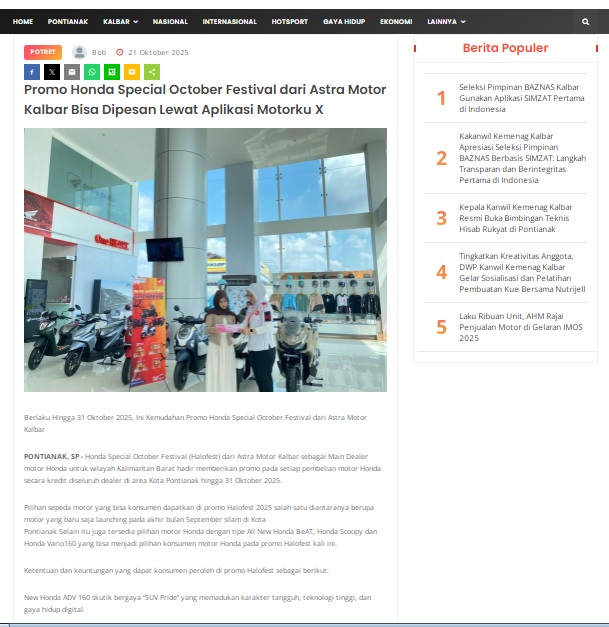 Promo Honda Special October Festival dari Astra Motor Kalbar Bisa Dipesan Lewat Aplikasi Motorku X by masmul 21 Oktober 2025 in Silahkan kunjungi https://www.suarapemredkalbar.com/read/potret/21102025/promo-honda-special-october-festival-dari-astra-motor-kalbarbisa-dipesan-lewat-aplikasi-motorku-x. You Might Like Regional Public Launching New ADV160 The SUV Pride Grand Launching New PCX 160 Truly Exceptional! Tetap hati-hati ya bro sist berkendara saat hujan.
