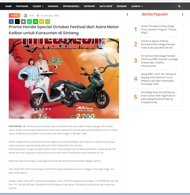 Promo Honda Special October Festival dari Astra Motor Kalbar untuk Konsumen di Sintang by masmul 16 Oktober 2025 in Silahkan kunjungi https://www.suarapemredkalbar.com/read/potret/16102025/promo-honda-special-october-festival-dari-astra-motor-kalbar-untuk-konsumen-di-sintang. You Might Like Regional Public Launching New ADV160 The SUV Pride Grand Launching New PCX 160 Truly Exceptional! Tetap hati-hati ya bro sist berkendara saat hujan.