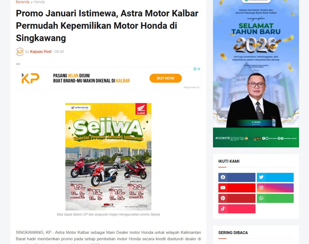 Promo Januari Istimewa, Astra Motor Kalbar Permudah Kepemilikan Motor Honda di Singkawang by Muhammad Arif 10 Januari 2026 in Silahkan kunjungi https://www.kapuaspost.web.id/2026/01/promo-januari-istimewa-astra-motor.html. Tags: astra Astra Motor kalbar Astra Motor Pontianak astramotor honda kalbar pontianak sepeda motor You Might Like Regional Public Launching New ADV160 The SUV Pride Grand Launching New PCX 160 Truly Exceptional! Tetap hati-hati ya bro sist berkendara saat hujan.