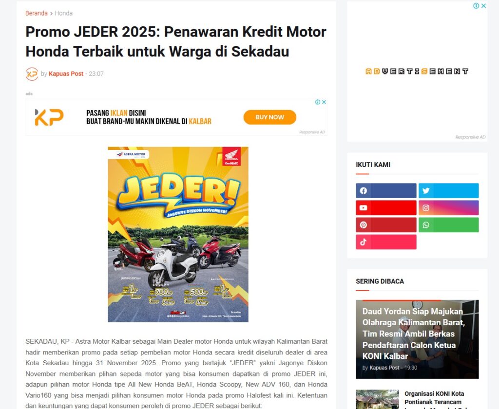 Promo JEDER 2025: Penawaran Kredit Motor Honda Terbaik untuk Warga di Sekadau by Muhammad Arif 21 November 2025 in Silahkan kunjungi https://www.kapuaspost.web.id/2025/11/promo-jeder-2025-penawaran-kredit-motor.html. Tags: astra Astra Motor kalbar Astra Motor Pontianak astramotor honda kalbar pontianak sepeda motor You Might Like Regional Public Launching New ADV160 The SUV Pride Grand Launching New PCX 160 Truly Exceptional! Tetap hati-hati ya bro sist berkendara saat hujan.