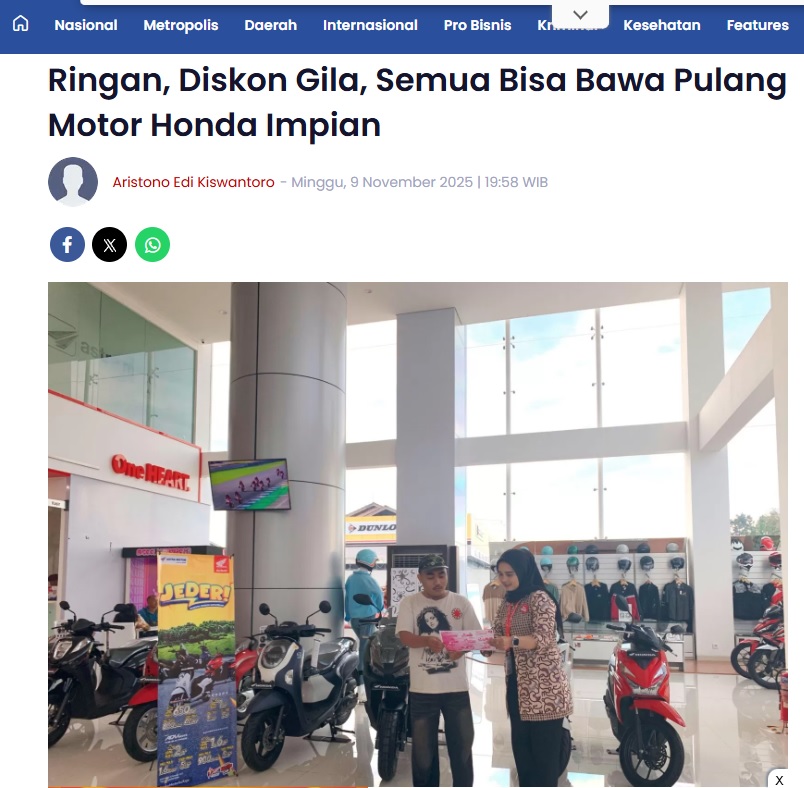Promo JEDER Astra Motor Kalbar: Cicilan Ringan, Diskon Gila, Semua Bisa Bawa Pulang Motor Honda Impian by Aristono Edi Kiswantoro 9 November 2025 in Silahkan kunjungi https://pontianakpost.jawapos.com/pro-bisnis/1466809795/promo-jeder-astra-motor-kalbar-cicilan-ringan-diskon-gila-semua-bisa-bawa-pulang-motor-honda-impian. You Might Like Regional Public Launching New ADV160 The SUV Pride Grand Launching New PCX 160 Truly Exceptional! Tetap hati-hati ya bro sist berkendara saat hujan.