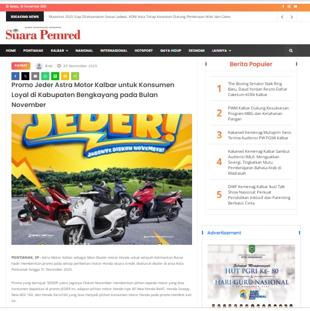 Promo Jeder Astra Motor Kalbar untuk Konsumen Loyal di Kabupaten Bengkayang pada Bulan November by masmul 20 November 2025 in Silahkan kunjungi https://www.suarapemredkalbar.com/read/potret/20112025/promo-jeder-astra-motor-kalbar-untuk-konsumen-loyal-di-kabupaten-bengkayang-pada-bulan-november. You Might Like Regional Public Launching New ADV160 The SUV Pride Grand Launching New PCX 160 Truly Exceptional! Tetap hati-hati ya bro sist berkendara saat hujan.