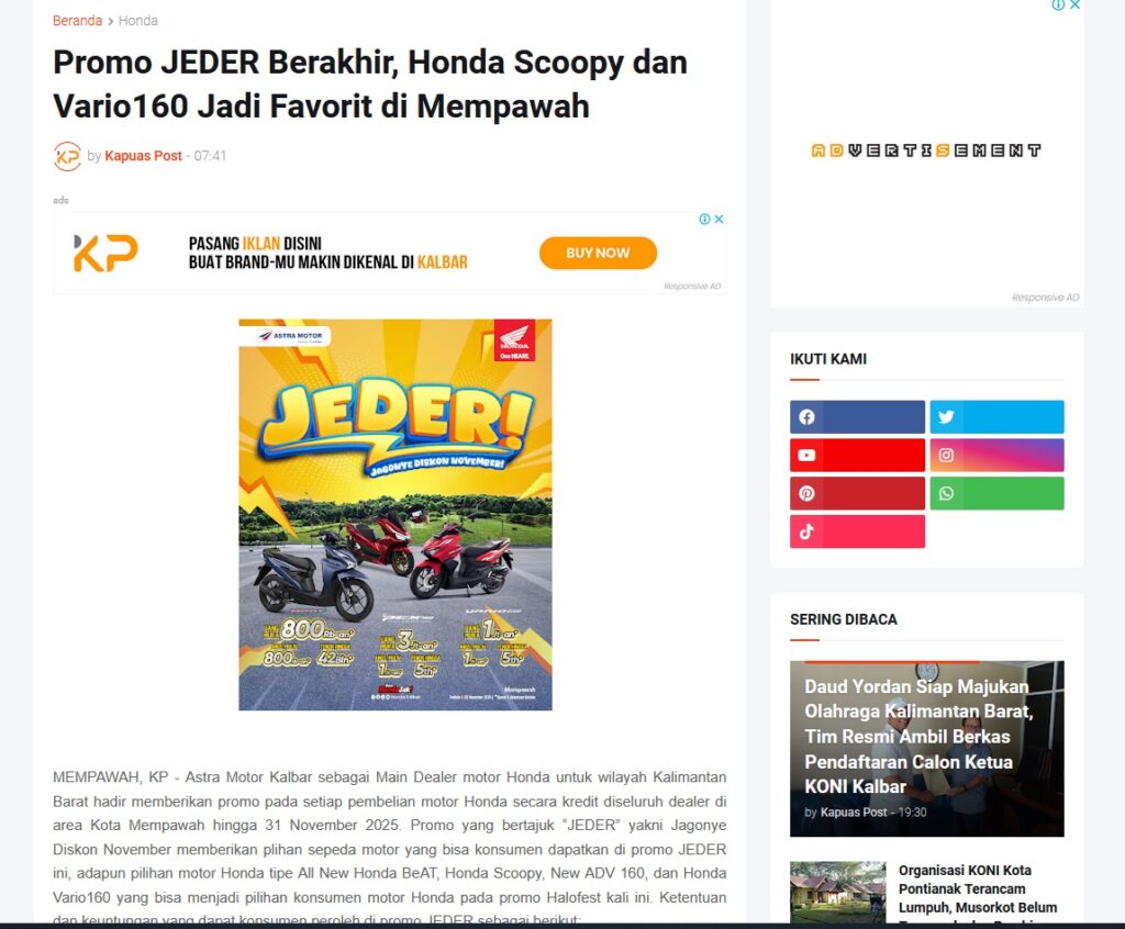 Promo JEDER Berakhir, Honda Scoopy dan Vario160 Jadi Favorit di Mempawah by Muhammad Arif 28 November 2025 in Silahkan kunjungi https://www.kapuaspost.web.id/2025/11/promo-jeder-berakhir-honda-scoopy-dan.html. Tags: astra Astra Motor kalbar Astra Motor Pontianak astramotor honda kalbar pontianak sepeda motor You Might Like Regional Public Launching New ADV160 The SUV Pride Grand Launching New PCX 160 Truly Exceptional! Tetap hati-hati ya bro sist berkendara saat hujan.