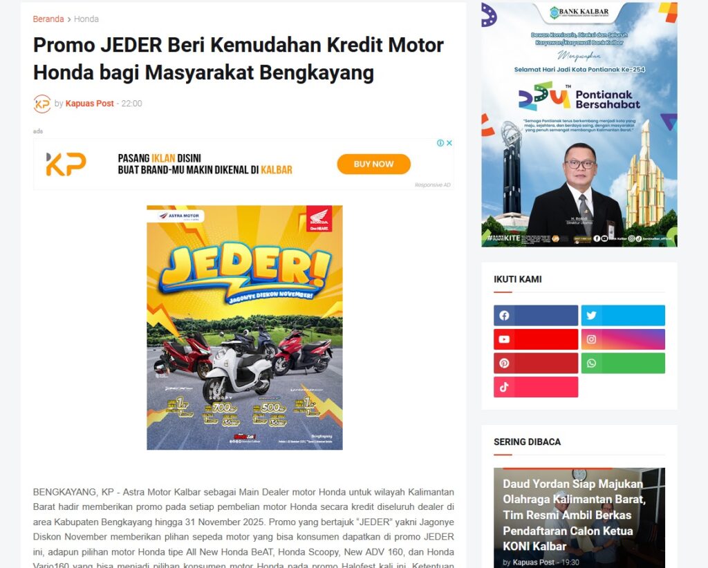 Promo JEDER Beri Kemudahan Kredit Motor Honda bagi Masyarakat Bengkayang by Muhammad Arif 16 November 2025 in Silahkan kunjungi https://www.kapuaspost.web.id/2025/11/promo-jeder-beri-kemudahan-kredit-motor.html. Tags: astra Astra Motor kalbar Astra Motor Pontianak astramotor honda kalbar pontianak sepeda motor You Might Like Regional Public Launching New ADV160 The SUV Pride Grand Launching New PCX 160 Truly Exceptional! Tetap hati-hati ya bro sist berkendara saat hujan.