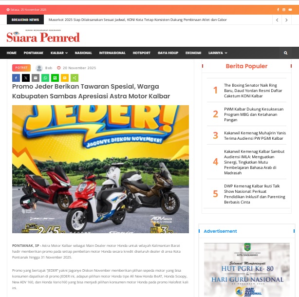 Promo Jeder Berikan Tawaran Spesial, Warga Kabupaten Sambas Apresiasi Astra Motor Kalbar by masmul 20 November 2025 in Silahkan kunjungi https://www.suarapemredkalbar.com/read/potret/20112025/promo-jeder-berikan-tawaran-spesial-warga-kabupaten-sambas-apresiasi-astra-motor-kalbar. You Might Like Regional Public Launching New ADV160 The SUV Pride Grand Launching New PCX 160 Truly Exceptional! Tetap hati-hati ya bro sist berkendara saat hujan.