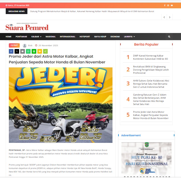 Promo Jeder dari Astra Motor Kalbar, Angkat Penjualan Sepeda Motor Honda di Bulan November by masmul 25 November 2025 in Silahkan kunjungi https://www.suarapemredkalbar.com/read/potret/25112025/promo-jeder-dari-astra-motor-kalbar-angkat-penjualan-sepeda-motor-honda-di-bulan-november. You Might Like Regional Public Launching New ADV160 The SUV Pride Grand Launching New PCX 160 Truly Exceptional! Tetap hati-hati ya bro sist berkendara saat hujan.