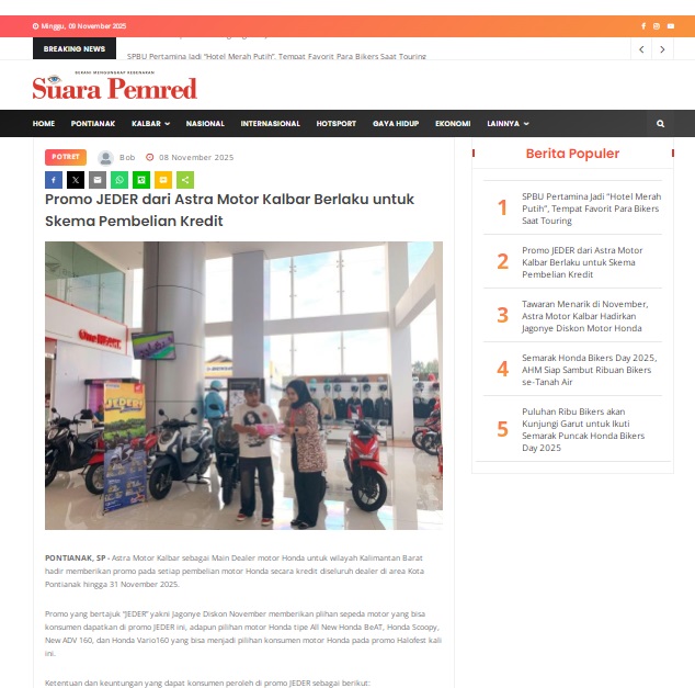 Promo JEDER dari Astra Motor Kalbar Berlaku untuk Skema Pembelian Kredit by masmul 8 November 2025 in Silahkan kunjungi https://www.suarapemredkalbar.com/read/potret/08112025/promo-jeder-dari-astra-motor-kalbar-berlaku-untuk-skema-pembelian-kredit. You Might Like Regional Public Launching New ADV160 The SUV Pride Grand Launching New PCX 160 Truly Exceptional! Tetap hati-hati ya bro sist berkendara saat hujan.