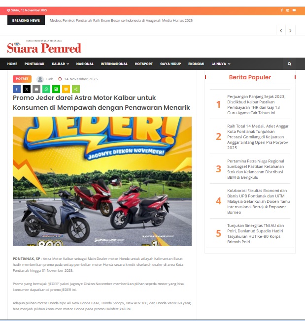 Promo Jeder dari Astra Motor Kalbar untuk Konsumen di Mempawah dengan Penawaran Menarik by masmul 14 November 2025 in Silahkan kunjungi https://www.suarapemredkalbar.com/read/potret/14112025/promo-jeder-darei-astra-motor-kalbar-untuk-konsumen-di-mempawah-dengan-penawaran-menarik. You Might Like Regional Public Launching New ADV160 The SUV Pride Grand Launching New PCX 160 Truly Exceptional! Tetap hati-hati ya bro sist berkendara saat hujan.