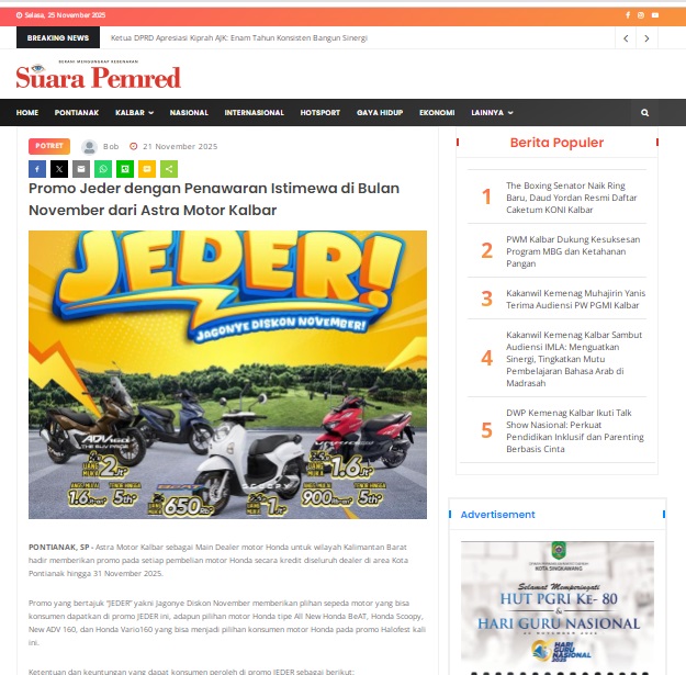 Promo Jeder dengan Penawaran Istimewa di Bulan November dari Astra Motor Kalbar by masmul 21 November 2025 in Silahkan kunjungi https://www.suarapemredkalbar.com/read/potret/21112025/promo-jeder-dengan-penawaran-istimewa-di-bulan-november-dari-astra-motor-kalbar. You Might Like Regional Public Launching New ADV160 The SUV Pride Grand Launching New PCX 160 Truly Exceptional! Tetap hati-hati ya bro sist berkendara saat hujan.