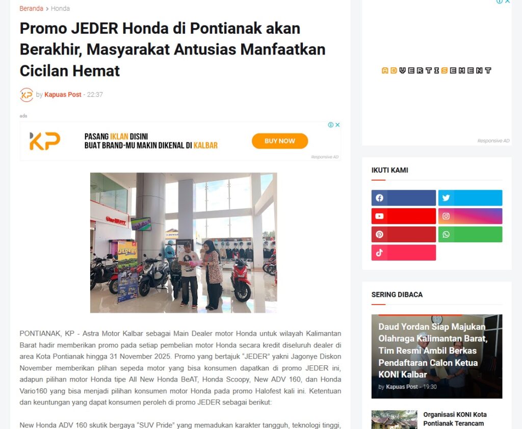 Promo JEDER Honda di Pontianak akan Berakhir, Masyarakat Antusias Manfaatkan Cicilan Hemat by Muhammad Arif 27 November 2025 in Silahkan kunjungi https://www.kapuaspost.web.id/2025/11/promo-jeder-honda-di-pontianak-akan.html. Tags: astra Astra Motor kalbar Astra Motor Pontianak astramotor honda kalbar pontianak sepeda motor You Might Like Regional Public Launching New ADV160 The SUV Pride Grand Launching New PCX 160 Truly Exceptional! Tetap hati-hati ya bro sist berkendara saat hujan.