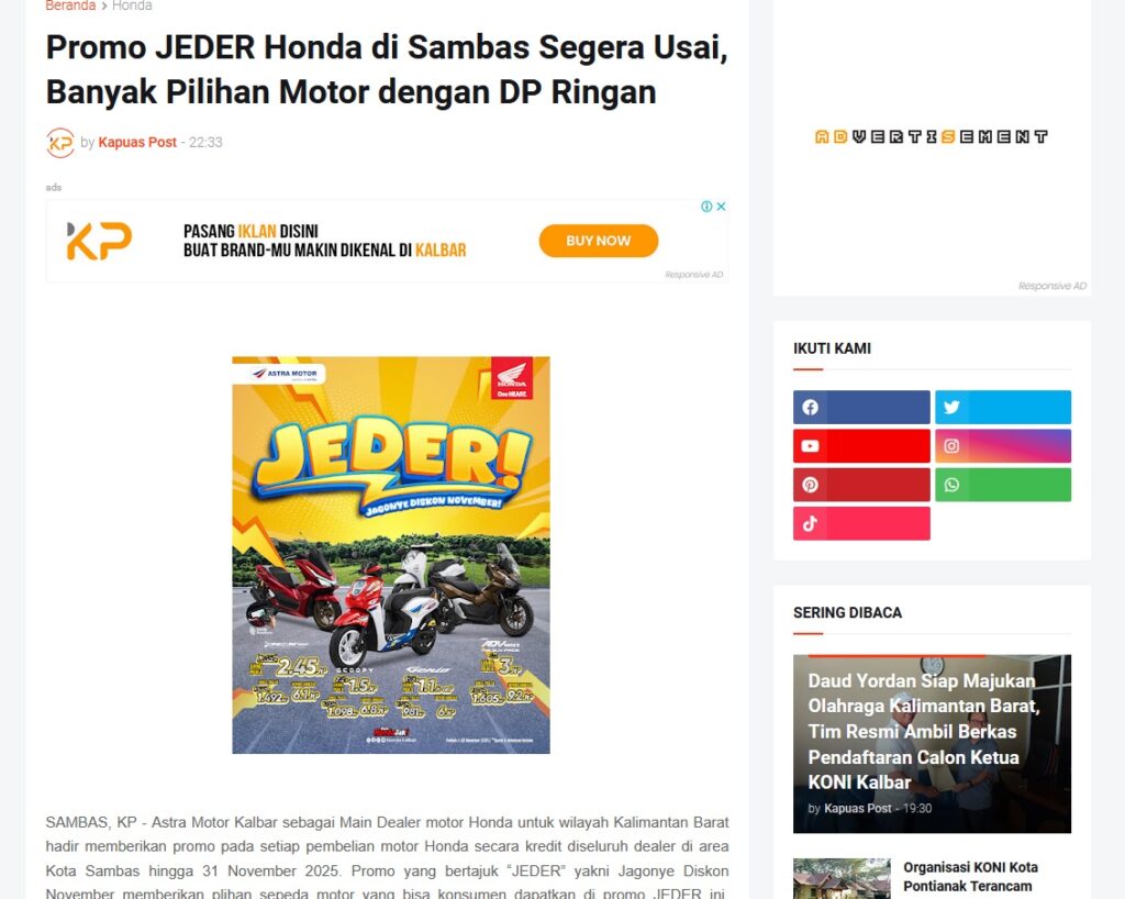 Promo JEDER Honda di Sambas Segera Usai, Banyak Pilihan Motor dengan DP Ringan by Muhammad Arif 27 November 2025 in Silahkan kunjungi https://www.kapuaspost.web.id/2025/11/promo-jeder-honda-di-sambas-segera-usai.html. Tags: astra Astra Motor kalbar Astra Motor Pontianak astramotor honda kalbar pontianak sepeda motor You Might Like Regional Public Launching New ADV160 The SUV Pride Grand Launching New PCX 160 Truly Exceptional! Tetap hati-hati ya bro sist berkendara saat hujan.