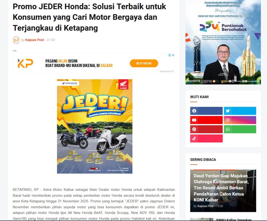 Promo JEDER Honda: Solusi Terbaik untuk Konsumen yang Cari Motor Bergaya dan Terjangkau di Ketapang by Muhammad Arif 15 November 2025 in Silahkan kunjungi https://www.kapuaspost.web.id/2025/11/promo-jeder-honda-solusi-terbaik-untuk.html. Tags: astra Astra Motor kalbar Astra Motor Pontianak astramotor honda kalbar pontianak sepeda motor You Might Like Regional Public Launching New ADV160 The SUV Pride Grand Launching New PCX 160 Truly Exceptional! Tetap hati-hati ya bro sist berkendara saat hujan.