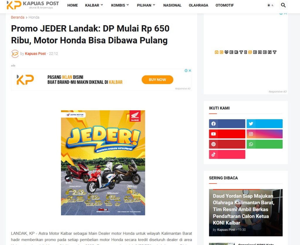 Promo JEDER Landak: DP Mulai Rp 650 Ribu, Motor Honda Bisa Dibawa Pulang by Muhammad Arif 20 November 2025 in Silahkan kunjungi https://www.kapuaspost.web.id/2025/11/promo-jeder-landak-dp-mulai-rp-650-ribu.html. Tags: astra Astra Motor kalbar Astra Motor Pontianak astramotor honda kalbar pontianak sepeda motor You Might Like Regional Public Launching New ADV160 The SUV Pride Grand Launching New PCX 160 Truly Exceptional! Tetap hati-hati ya bro sist berkendara saat hujan.