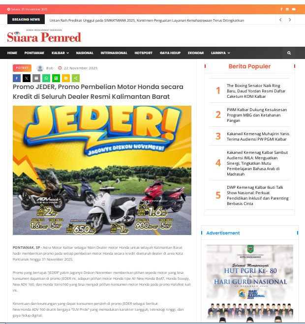 Promo JEDER, Promo Pembelian Motor Honda secara Kredit di Seluruh Dealer Resmi Kalimantan Barat by masmul 22 November 2025 in Silahkan kunjungi https://www.suarapemredkalbar.com/read/potret/22112025/promo-jeder-promo-pembelian-motor-honda-secara-kredit-di-seluruh-dealer-resmi-kalimantan-barat. You Might Like Regional Public Launching New ADV160 The SUV Pride Grand Launching New PCX 160 Truly Exceptional! Tetap hati-hati ya bro sist berkendara saat hujan.