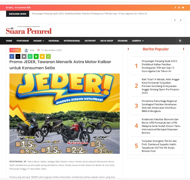 Promo JEDER, Tawaran Menarik Astra Motor Kalbar untuk Konsumen Setia by masmul 13 November 2025 in Silahkan kunjungi https://www.suarapemredkalbar.com/read/potret/13112025/promo-jeder-tawaran-menarik-astra-motor-kalbar-untuk-konsumen-setia. You Might Like Regional Public Launching New ADV160 The SUV Pride Grand Launching New PCX 160 Truly Exceptional! Tetap hati-hati ya bro sist berkendara saat hujan.