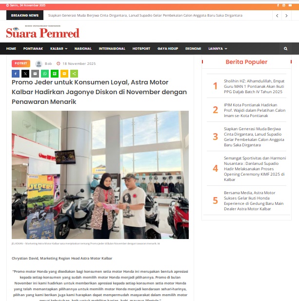 Promo Jeder untuk Konsumen Loyal, Astra Motor Kalbar Hadirkan Jagonye Diskon di November dengan Penawaran Menarik by masmul 18 November 2025 in Silahkan kunjungi https://www.suarapemredkalbar.com/read/potret/18112025/promo-jeder-untuk-konsumen-loyal-astra-motor-kalbar-hadirkan-jagonye-diskon-di-novemberdengan-penawaran-menarik. You Might Like Regional Public Launching New ADV160 The SUV Pride Grand Launching New PCX 160 Truly Exceptional! Tetap hati-hati ya bro sist berkendara saat hujan.